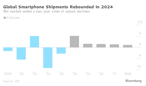 Bloomberg cites a new report from market tracker IDC showing that global 2024 handset shipments are forecasted to increase by 6.2% or an estimated 1.24 billion units.