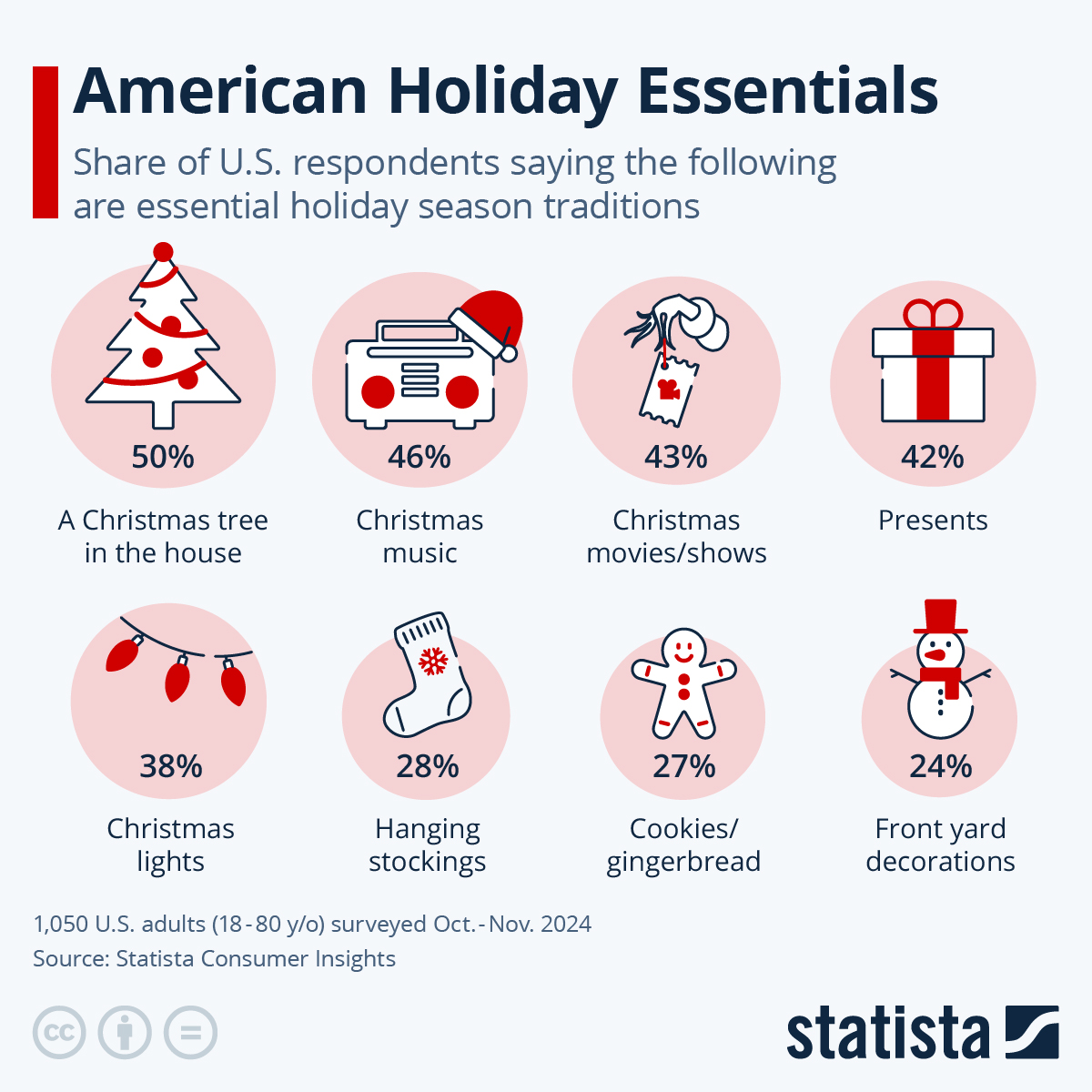According to Statista Consumer Insights, a Christmas tree in the house tops the list of holiday must-haves this year, with 50 percent of Americans considering it essential to a proper celebration.