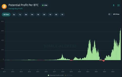 According to Whale Alert, the average profit per BTC is at an all-time high of $67,088, at the time of writing.