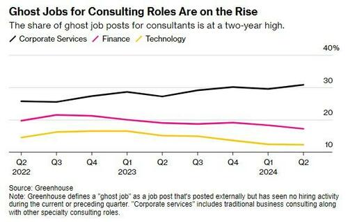 In the world of consulting, these 'ghost’ listings rose to 31% in Q2, up from 26% two years ago, the report says. These jobs are seen as „a bellwether for the white-collar economy”, the report says.
