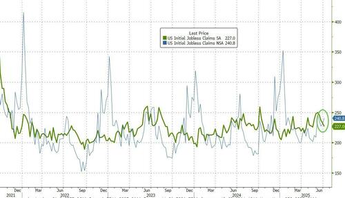Having risen to eight month highs just a couple weeks ago, initial jobless claims tumbled back to 227k last week and well within the comfortable low end range of the last four years…
