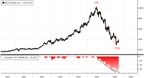 Shares of Novo Nordisk in Copenhagen surged 7% on the announcement of the study, but remain down 36.5% year-to-date and more than 61.5% below the June 2024 peak of DKK 1,000. For Goldman analysts like Novo superbull James Quigley, the question is whether the 37% rebound since early August marks an actual bottom, or just another dead cat bounce.