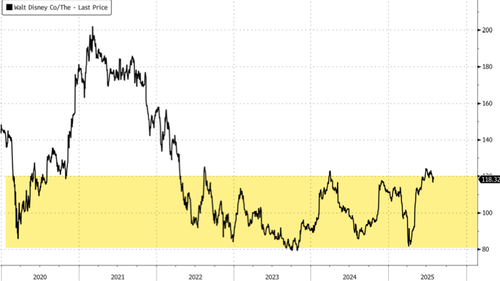 Disney shares are trading lower in premarket following Q3 results that were broadly in line but revealed underlying softness. The company raised full-year adjusted EPS guidance to $5.85 (from $5.75), ahead of the Bloomberg Consensus $5.77 estimate. While adjusted EPS of $1.61 beat consensus ($1.46), investor sentiment was dampened by continued deterioration in the conventional entertainment TV segment, which posted a sharp year-over-year decline. The theme here is that this segment-level weakness overshadowed strength in parks and streaming.