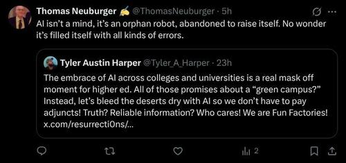 Arnaud Bertrand has the best explanation of what AI is at its core. It’s not a thinking machine, and its output’s not thought. It’s actually the opposite of thought — it’s what you get from a Freshman who hasn’t studied, but learned a few words instead and is using them to sound smart. If the student succeeds, you don’t call it thought, just a good emulation.