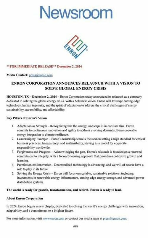 There was a lot of chatter on Monday morning about defunct Enron rising from the ashes after an X account named „Enron” posted, „We’re back. Can we talk?”