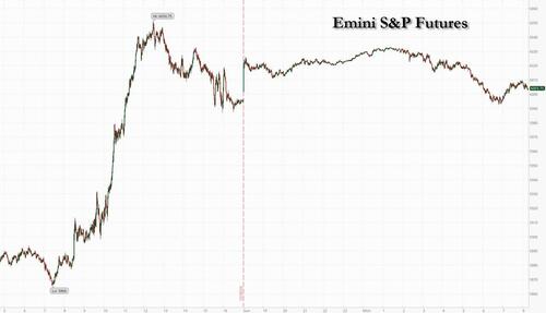 US equity futures entered the last week of 2024 gingerly and steady in subdued trading as traders, already on the ski slopes or in various warm, non-extradition countries, assessed the outlook for economic growth and interest rates. The dollar gained after a US government shutdown was averted in the last minute. As of 8:10am, contracts on the Nasdaq 100 added 0.4% and those on the S&P 500 were little changed, erasing an earlier gain, following a sharp rebound on Friday after the core PCE index increased at the slowest pace since May. Europe’s stock benchmark edged higher. Market gains will likely be capped by the continued rise in rates which has seen 10Y yields rise 2bps to 4.55%. Oil, gold and bitcoin all dropped while a Bloomberg gauge of the dollar rose after sliding 0.5% on Friday. Today’s macro data include the Chicago Fed, Durable Goods, New Home Sales and the Conference Board Consumer Confidence.