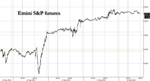 Futures are flat, erasing an earlier modest gain, ahead of a very busy week which will see the first Fed rate cut since March 2020. As of 7:45am, S&P futures were down fractionally, with small-caps outperforming following a trend from late last week as investors price in a 50bps rate cut on Wednesday. Nasdaq futures are down 0.3% as Semis lag and the Mag7 are mixed and AAPL slumps as much as 2.4% as noted analyst Ming-Chi Kuo notes that, based on his first weekend pre-order analysis, demand for the iPhone 16 Pro series is lower than expected. There was little reaction in markets to the second attempt to assassinate Donald Trump. Shares of Trump Media & Technology rose as much as 10% in premarket trading after the former president said he has “absolutely no intention of selling” his stake when a lockup expires this week. While JPM’s Andrew Tyler asks rhetorically this morning „let’s see if last week’s bid returns„, it does not look very likely since we just entered the worst 2 week calendar period for the year, and stocks enter a buyback blackout, plus there is no tech conference to spike the euphoric AI narrative yet again. Bond yields are down as the curve bull steepens, pressuring the USD which slides for the 4th day in a row to its lowest level in more than eight months. The move was driven by strength in the yen, which touched the highest since July 2023 amid speculation this week’s slew of central bank decisions will lead to a narrowing interest rate differential between the US and Japan. Commodities are higher with Energy and Metals boosting the index. Today is a light macro day ahead of tomorrow’s Retail Sales and Weds’ Fed Mtg where the market remains split on 25 o5 50bps.