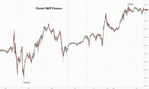 US equity futures are flat as the yield curve sees slight steepening; for once, the US is not benefiting from the risk-on rally seen in EU/APAC. As of 8:00am ET, S&P futures are fractionally in the green reversing earlier losses as traders await a busy line-up of Fed speakers and data releases after the index notched its 54th closing high of the year on Monday; Nasdaq 100 futures are down 0.1% even though Mag7 names are mostly higher in the premarket and Semis are bid. The USD is lower as the commodity complex catches a bid; WTI, silver, and sugar the outperformers; earlier Bloomberg reported China moved to restrict exports of rare earth metals to the US used in high-tech/military applications (gallium, germanium, antimony, and other superhard materials). Today’s macro focus will be on JOLTS and Vehicle Sales.