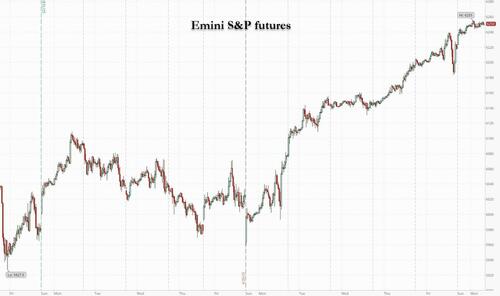 In premarket trading, Tesla is the only stock among Magnificent 7 companies falling, down 0.8%, as President Trump’s landmark budget bill passed a key senate hurdle over the weekend. The bill cuts electric vehicle and other clean energy credits. Other Mag7 names are all higher (Amazon +0.6%, Meta +1.9%, Apple +0.8%, Nvidia +0.7%, Alphabet +1.2%, Microsoft +0.6%).