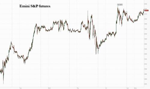 US equity futures reverse earlier losses and trade near session highs, with small cap/Russell outperformance pointing to a further potential squeeze in high-beta names as investors monitor talks between the US and China in London to defuse tensions over rare-earth minerals and advanced technology. As of 8:00AM, S&P futures rose 0.2% after the main gauge broke through the 6,000 level for the first time since February at the end of last week. Nasdaq 100 futs gained 0.1%, with Mag7 names mixed premarket, Semis are higher, and cyclicals poised to outperform Defensives. Chinese shares trading in Hong Kong entered a bull market. European stocks barely budged, while a gauge for emerging-market equities was set for its highest close in more than three years. Bond yields are lower, and USD is weaker as commodities are led by Energy and precious metals; silver continues to close the gap to gold, although today it is platinum and palladium’s turn to shine. Today’s focus is the US/China trade mtg in London: overnight, HK and HSTECH performed well into the summit. Macro data prints include NY Fed’s 1-year inflation expectations (3.63% prior print) which could affect the yield curve as the Fed is in its blackout window.