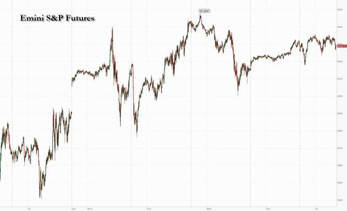 US equity futures gained for the second day ahead of a shortened trading session after the Thanksgiving holiday, with Treasuries also rising and the dollar slipping amid mounting (if naive) speculation that president-elect Donald Trump will temper his most extreme trade policies drove the dollar to its biggest weekly loss in three months. As of 8:00am ET, S&P 500 and Nasdaq 100 futures both rose 0.2%, pointing to modest gains in Friday’s post-holiday trading session on Wall Street. The 10-year Treasury yield fell four basis points to 4.22%, the lowest in more than a month, as cash trading resumed after the Thanksgiving holiday. The Bloomberg Dollar Spot Index fell 0.2%, ending an 8 week winning streak and heading for its biggest weekly loss in three months. Oil prices oil prices reverse an earlier loss and trade near session highs with WTI now at $69.20, while gold adds $25 to $2660. Bitcoin rises above $96,000. There is nothing on today’s macro calendar.