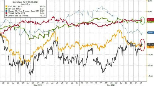 Since the last FOMC meeting – on November 7th – the dollar and stocks have rallied while gold and oil have lagged as the dollar flatlined (amid significant volatility on the way from various macro data surprises)…