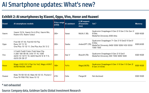 Goldman’s Allen Chang and Verena Jeng wrote in a note to clients over the weekend that an increasing number of Chinese handset brands are releasing AI smartphones for the mid-end market for as low as $168.
