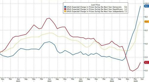 For much of 2025 we have been mocking the University of Michigan survey, and especially its short and long-term inflation expectation question, for the simple reason that the divergence between republican and democrat respondents is no longer merely grotesque but is a caricature of Goebbelsian propaganda, meant to spark fear that runaway inflation is coming and crash markets (even as today’s CPI showed – again – it isn’t).