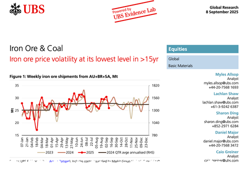 Iron ore prices have shuffled up to ~$105/t last week with activity rebounding after the military parade and on improving sentiment (due to the China Work Plan & Fed rate cut expectations). On the key signals we note: 1) Iron ore inventories at ports (Fig24) and at mills (Fig26) in China are broadly stable w/w; 2) Iron ore shipments from traditional markets (Fig2) continue to recover with Brazil +3% YTD (> Access Dataset); 3) Steel production in China accelerated in early-Aug in the CISA data (Fig10), though MySteel utilisation rate data remains broadly flat (Fig14); 4) Steel exports from China remain strong at ~106Mtpa in Aug despite increasing trade restrictions (Fig19) – Baosteel expects China steel exports to remain >100Mt in 2025, albeit softer in 4Q; 5) Positioning on the Dalian has turned incrementally more negative and is now at -2Mt of net contracts (Fig37). We have Neutral ratings on Vale, RIO & BHP, and Sell on FMG & KIO; we est. spot 2026 FCF yield of BHP at 4%, RIO at 8%, Vale at 15% (interactive model).