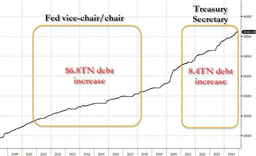 First, it was under Yellen’s watch that the US experienced its biggest debt increase in history. As shown below, Yellen was Fed chair from Oct 2010 until Feb 2014, and then Fed Chair from Feb 2014 until Feb 2018, a period during which she intentionally kept rates at zero for almost the entire duration of her „apolitical” tenure. We say „apolitical” because in January 2021 the mask came off, and Yellen was picked for her political ideology to serve as Biden’s top debt printing Democrat by taking control of the US Department of Treasury, where on more than one occasion she intentionally manipulated US debt issuance to boost risk assets at the expense of a harrowing debt crisis that looms under Trump’s administration as trillions in debt now have to be rolled over at a much higher rate. But more to the point, under Yellen total US debt increased by $6.8 trillion while she was Fed Chair/vice-Chair and then another $8.4 trillion while she has been Biden’s Treasury Secretary.