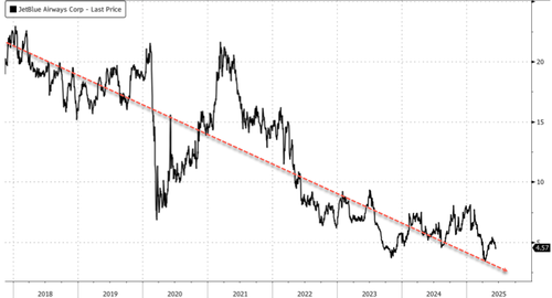 In markets, shares of JetBlue traded 5% lower in premarket trading. On the year, shares have tumbled 42% on the year as of Monday’s close.