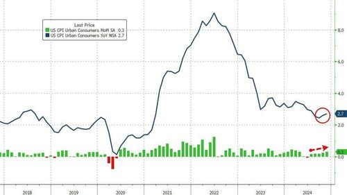 Having accelerated MoM for the past four months, analysts expected today’s CPI print (for November) will rise once again to +0.3% MoM and they were dead on (the biggest MoM rise since April). The 0.3% MoM rise pushed headline CPI up 2.7% YoY – the highest since July…