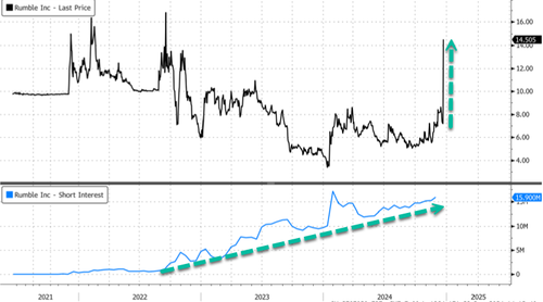 As of 1400 ET, Rumble shares in New York had surged a whopping 100%, nearing record highs. According to the latest Bloomberg data, more than 18% of the float is short, equivalent to about 15.9 million shares.