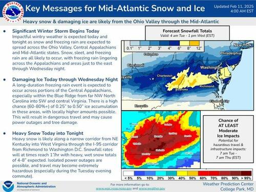 „Impactful winter weather is expected today and tonight as snow and freezing rain are expected to spread across the Ohio Valley, Central Appalachians, and Mid-Atlantic states,” the NWS Weather Prediction Center wrote in an early morning update on X.