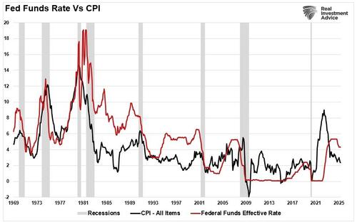 The historical shortcomings of the Fed’s actions, repeated policy mistakes, and flawed outlooks are clearly evident. The Fed hikes rates, creates an economic or credit-related event, and then cuts rates to fix it.