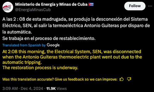 „At 2:08 this morning, the Electrical System, SEN, was disconnected when the Antonio Guiteras thermoelectric plant went out due to the automatic tripping. The restoration process is underway,” the ministry wrote on X.