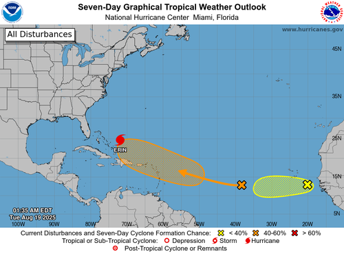 At 0500 ET, Erin was approximately 700 miles southwest of Bermuda and 750 miles south-southeast of Cape Hatteras.