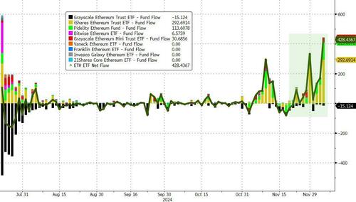 The flows come after the second-largest cryptocurrency by market cap has risen about 60% in the past month. It’s currently trading at around $3,900.