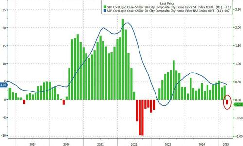 For the first time since January 2023, US Home Prices, according to S&P CoreLogic Case-Shiller’s 20-City Composite Index, fell (-0.12% MoM) in March (the latest data available). That dragged the YoY change in home price down to +4.07%, the lowest since August 2023