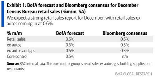 The all-knowing folk at BofA expect a hotter than consensus print for retail sales this morning, as seasonal distortions play a factor (there were two shifts in the December calendar relative to 2023. First, a late Thanksgiving pushed Cyber Monday into December. Second, there were four weekends in December 2024, vs. five in 2023. On balance, these factors led to a slightly more favorable seasonal factor (SF) in December 2024 than December 2023)