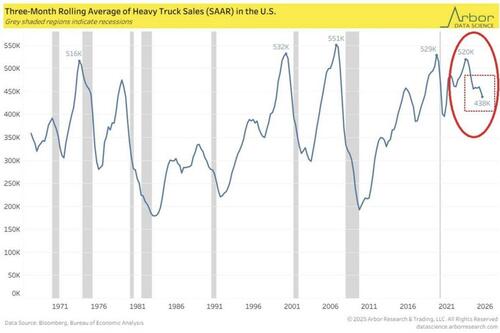 U.S. heavy truck sales are falling at a pace rarely seen outside of recessions, raising concerns about the health of the economy. Sales dropped by 20,000 in August to an annualized rate of 422,000, the lowest since January 2022. The three-month moving average has now slipped to 438,000—the weakest level since the pandemic downturn in 2020.