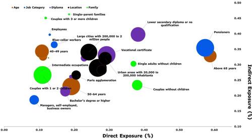 Both groups also exhibit high levels of indirect exposure, with indirect transfers representing around 40% of their initial income (before redistribution). Across the population, however, the level of indirect exposure is lower and more evenly distributed.