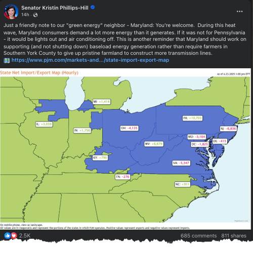 Pennsylvania State Sen. Kristin Phillips-Hill (R-York) wrote in a late Monday Facebook post that the state’s surplus electricity supplies were exported to Maryland during Monday’s peak demand surge, as temperatures in the region approached 100°F. She credited Pennsylvania’s stable power grid with preventing a blackout crisis in „our 'green energy’ neighbor – Maryland.” As we’ve reported on several occasions, far-left climate Marxists running Maryland have mismanaged the grid, which now teeters on the verge of a Spain-style blackout disaster if outside energy imports are not secured.